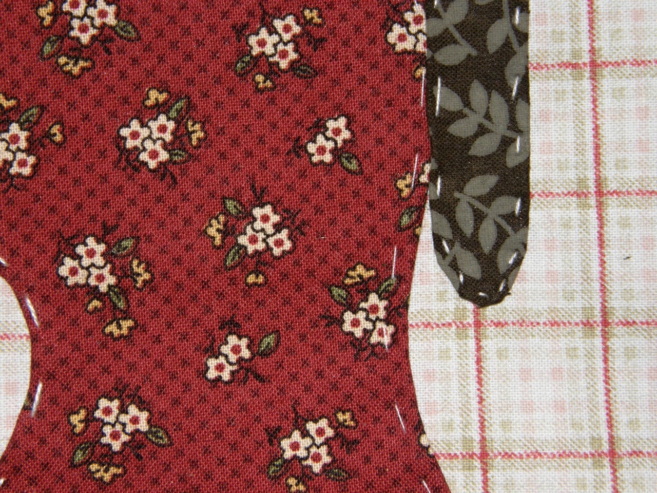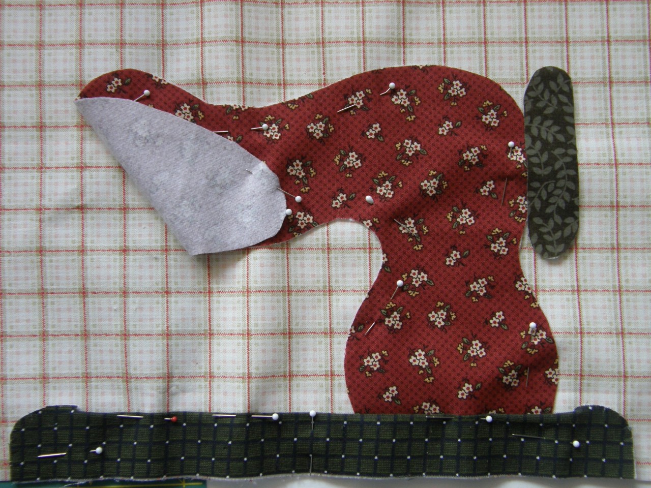 Následující postup je stejný jako u předešlých bloků - aplikací: vytisknem si vzor aplikace, vystřihnem si jí, zvolíme látku podkladovou i na aplikaci, přišpendlíme celý blok k látce a vystřihneme s malými přídavky. Poté podkladovou látku i aplikaci podlepíme tenkým vlizelínem. Aplikaci umístíme dle zadání na podkladovou látku a přišpendlíme. Zaoblené okraje lehce nastřihneme.