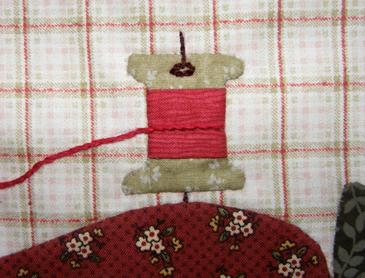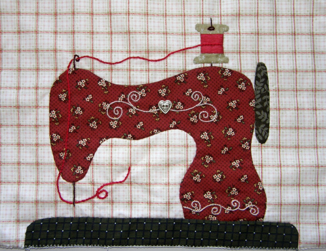 Celý tento blok je doplněn malou aplikací cívky s nití a dalšími výšivkami. Aplikac cívky si vyrobíme opět ze vzoru výše popsaným postupem. Vše zakončíme výšivkymi v různých barvách. Výšivky na blok přeneseme pomocí kopírovacího papíru na textil.
