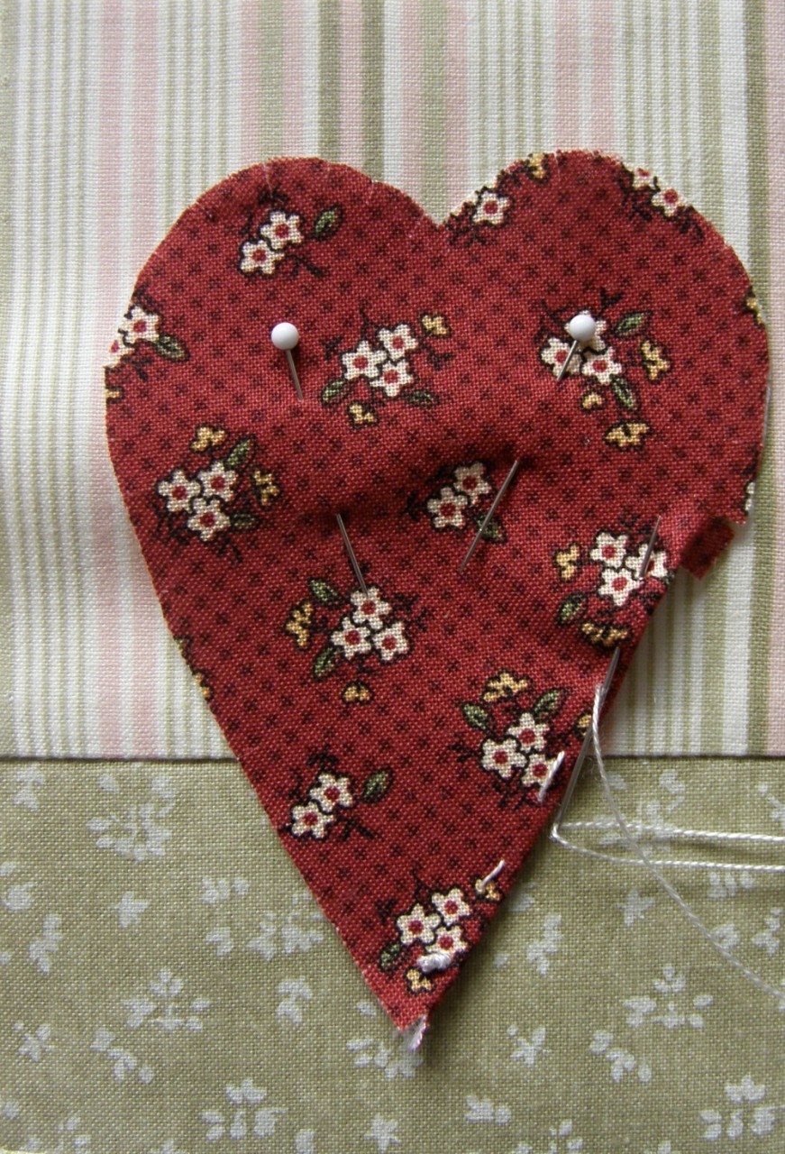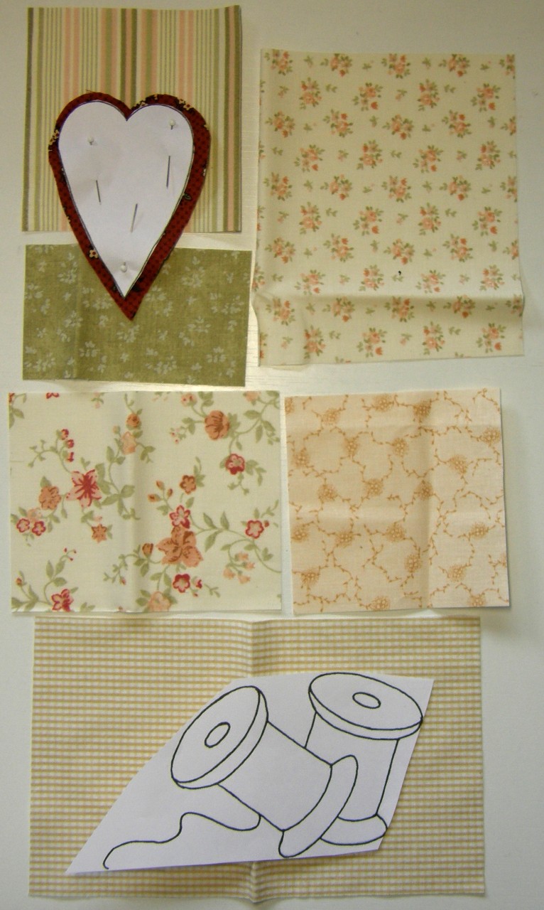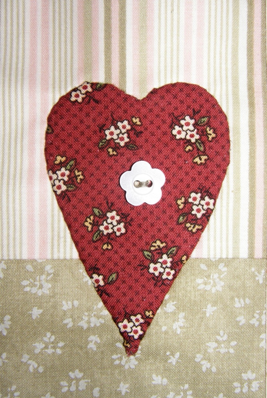 Blok 5a je sestaven ze dvou látek, které sešijeme, podlepíme jednostranným vlizelínem. Na tento blok aplikujeme srdce. Při aplikaci postupujeme standardně: vystřihneme srdce z papíru, přiložíme na látku a přišpendlíme, vystřihneme a podlepíme vlizelínem. Okraje nastřihneme 3 - 5 mm, aby se nám dobře tvarovali křivky. Přiložíme na látku a přišpendlíme, okraje otočíme dovnitř a nastehujeme. Poté celé srdce zadním stehem přišijeme ke spodní látce. Nakonec srdce ozdobíme knoflíčkem.