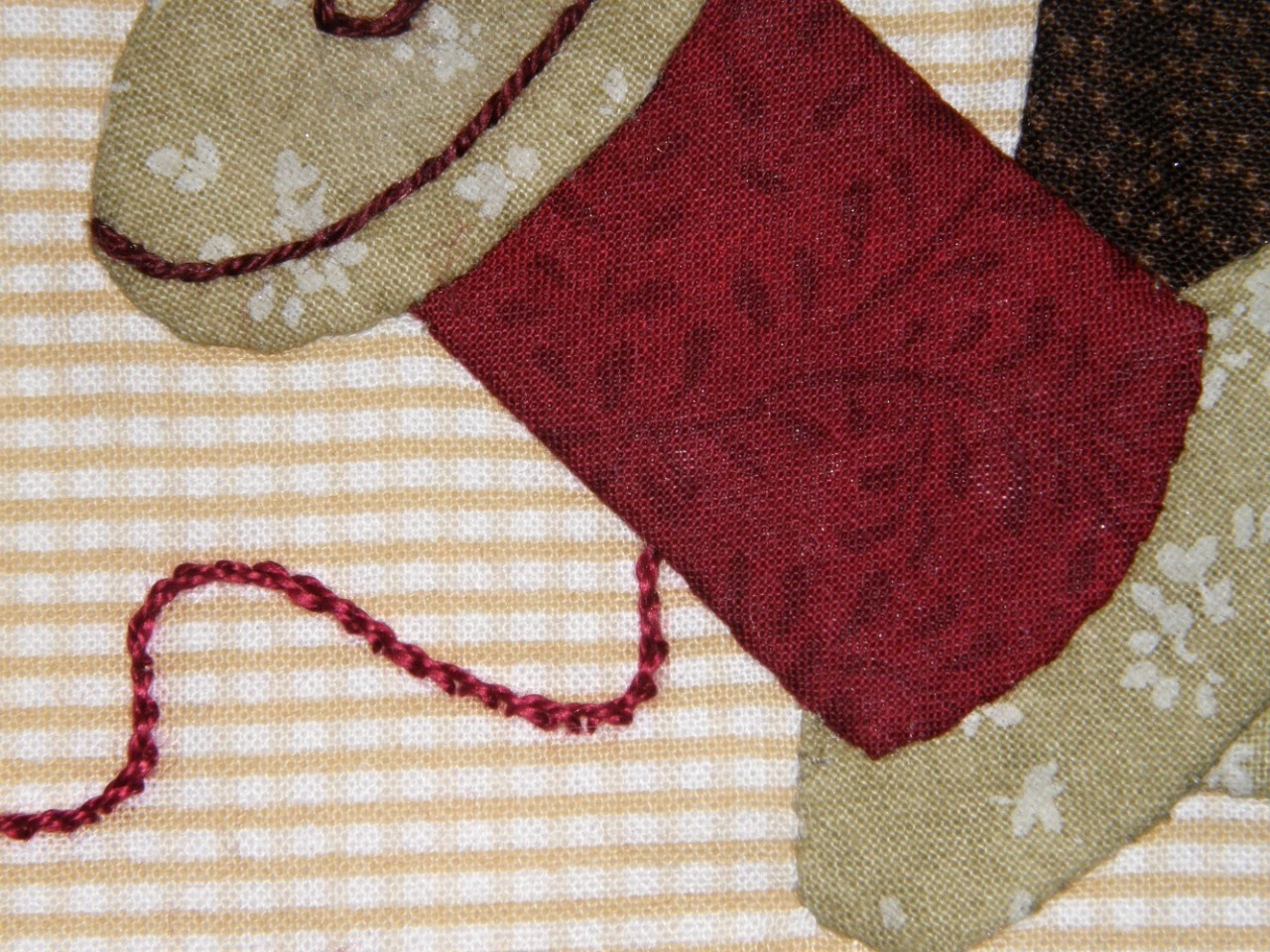 Vše doplníme výšivkou stonkových stehem, která znázorňuje rozmotanou niť. Aby dojem byl úplný, doplníme výšivku umělou jehlou.